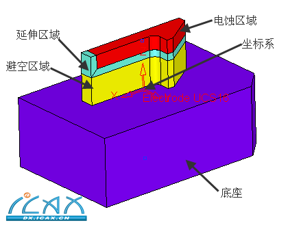 3:电极由电蚀区域(放电面)、延伸区域(延伸面)、避空区域、底座及坐标系组成。如图二所示。