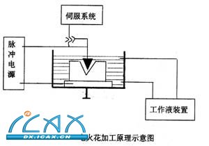 2:电火花加工的原理,基于工具(电极)和工件(模型)之间脉冲性火花放电时的电腐蚀现象来蚀除多余的金属,以达到对零件的尺寸、形状及表面质量预定的加工要求。如图一所示。
