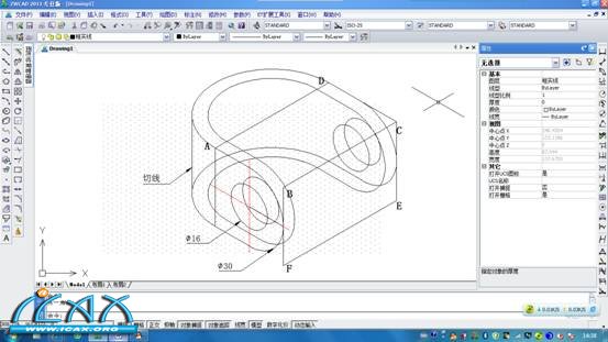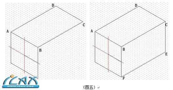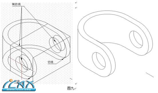 轴测图是反映物体三维形状的二维图形,其富有立体感,能帮助人们更快、更清楚地认识产品结构;通过CAD软件绘制一个零件的轴测图是在二维CAD平面中完成,它相对三维图形更简洁方便,下面我们就通过一个实例看看如何在中望CAD软件中实现轴测图的绘制。 首先设定绘图环境,命令行输入:units 设置绘图单位:长度类型为“小数”,长度精度为“0.00”;角度类型为:“十进制度数”,角度精度为0.00,其余按默认设置。其次设置栅格和捕捉,在状态栏中的“对象捕捉”上点击右键选择设置,打开“草图设置”窗口,将捕捉类型设置为等轴测捕捉;设置捕捉Y轴间距为1、设置栅格Y轴间距为1并点选“启用捕捉”和“启用栅格”复选框,打开捕捉和栅格,如图一所示: 图一 根据制图标准,在“图层特性管理器”中建立图层,并进行层属性设置,结果如图二所示: 图二 将当前图层设置为“中心线”层,利用line命令绘制轴孔中心线(建议开启极轴追踪),在绘图区域,任意点取一点作为轴孔中心线的起始点,水平中心线的长为35,角度:150;垂直中心线的长度为35,角度:90。如图三所示: 图三 接下来绘制万向联轴节-长方体;将当前图层设置为“粗实线”,利用line命令绘制基准长方体,该长方体侧面是30的正方形,长为50,以中心线交点为绘制线段的起点,利用极轴跟踪功能,点取相对极坐标为15〈330的点作为线段的另一端点;重复line命令,依次点取相对极坐标为:15〈270、30〈150、30〈90、30〈330、30〈270,完成左平面的绘制(图四)。 图四 单击键盘上的F5键,切换光标到顶平面,分别选取A、B两点,绘制长为50的直线,连接C、D两点,完成顶平台的绘制。同理按F5键,切换光标至右平面,点取C点,绘制长为30的直线CE,连接EF,完成基准长方体的绘制(图五)。 绘制万向联轴节- 半圆环体,利用椭圆命令ellipse(同心圆I)绘制顶面半圆环,以AD直线中心为圆心绘制直径分别为了50和40的同心圆,利用trim修剪命令剪去多余弧线,并利用copy命令将顶面半圆环复制到底面如图六所示: 按F5键,将光标切换到右平面,利用line命令捕捉顶平面和底平面外环体切点绘制一条切线;再将光标切换到左平面,利用椭圆命令ellipse(同心圆I)以轴孔中心线交点为圆心绘制直径为30和16的圆,修剪结果如图七所示。 利用copy命令绘制平行于左平面的各平面,结果如图八所示: 图八 利用line命令和复制对象命令分别绘制万向联轴节中的切线和辅助线,最后利用trim命令和删除命令对图形进行处理,去除多余的线以及应该隐藏的线段,最终万向联轴节的绘制结果如图九所示: |