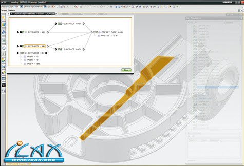 基于特征的建模 新的特征浏览器为特征及其关系提供了丰富直观的图形视图,帮助您更快速而直观地理解设计意图和设计变更的影响。当鼠标在浏览器中悬停在某个特征之上时,对象将在图形窗口和零部件导航器中突出显示,并将显示与其他特征和对象的关系。