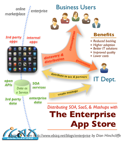 这是马克.吐温的名言。如果应用到软件开发领域,可以这么说——开发复杂的软件很容易,但开发简单的软件却难如登天。我认为,问题的核心在于,人们都试图将PLM定义得复杂且繁琐(如同复杂的软件包)。制造企业需求的多元性导致供应商不得不往软件里添加越来越多的模块(功能)。所以呢,软件变得庞大、复杂,而且价格不菲。我觉得Dion Hinchliffe所提出的“业务应用”很有意思。下面是“业务应用”的概念图。