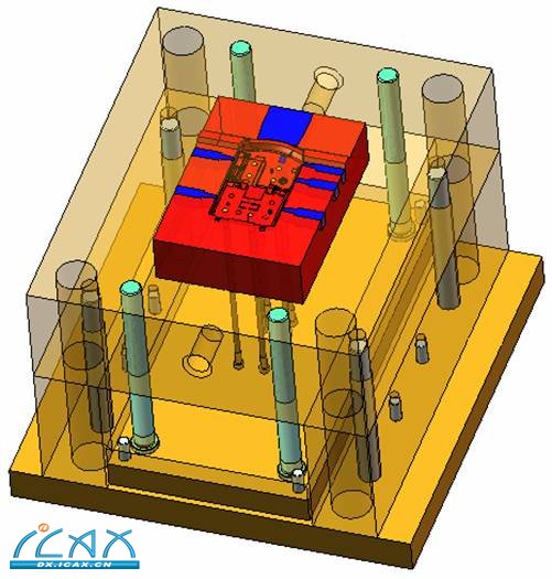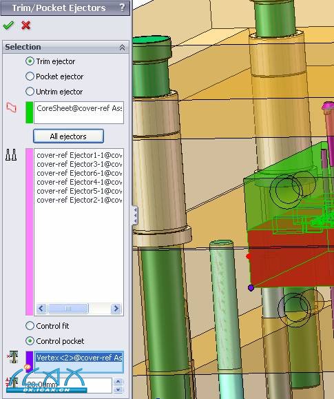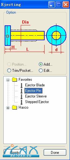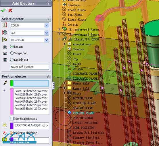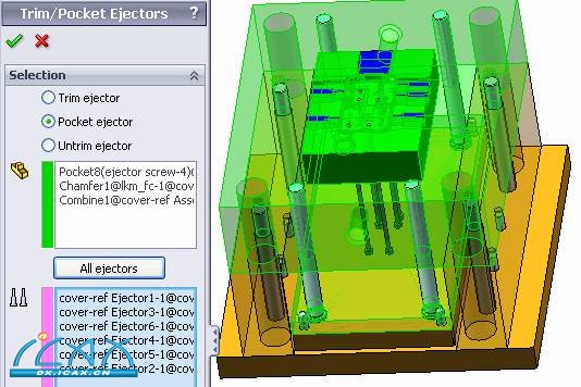 加顶针:转到顶组件,选add,选择顶针类型,按apply 点选ejector plane,选择草图点,给定顶针高度、大小,打勾确定加载顶针 修剪顶针 选择coresheet作为为修剪工具曲面,点all ejectors,给定避空高度及参考点打勾确定,高出后模面部分的顶针被修剪掉 开顶针孔:选择要开顶针孔的零部件,选择all ejectors,打勾确定 修剪、开孔后如图 |