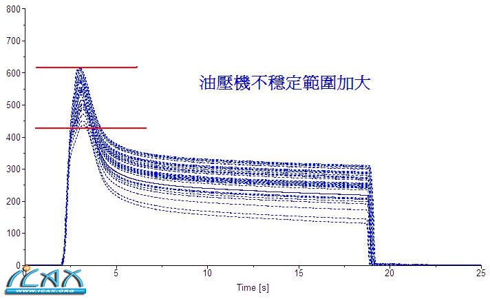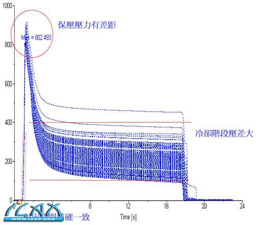 图7 为一全电式射出成型机的连续射出模内压力曲线,由图中可以看出其保压阶段有些微的不稳定现象产生,但是在冷却阶段,其模穴内压力则呈现非常不稳定,产生极大差异之现象。 图7. 全电机连续射出模内压力曲线。 图8 则为油压式射出成型机的连续射出模内压力曲线,可以看出其模内压力在射出阶段,即呈现非常不稳定之状态。图9 为碟式螺杆微成型射出机的连续射出模内压力曲线,由图中可以清楚看出其模穴的内压力呈现非常稳定之状态,且其响应速度非常快速,几乎于0.1 内即达成最大射出压力,完全满足成型精密微小产品或是微结构产品之机台需求。 图8. 油压机连续射出模内压力曲线。 图9. 蝶式螺杆微成型射出机连续射出模内压力曲线。 |