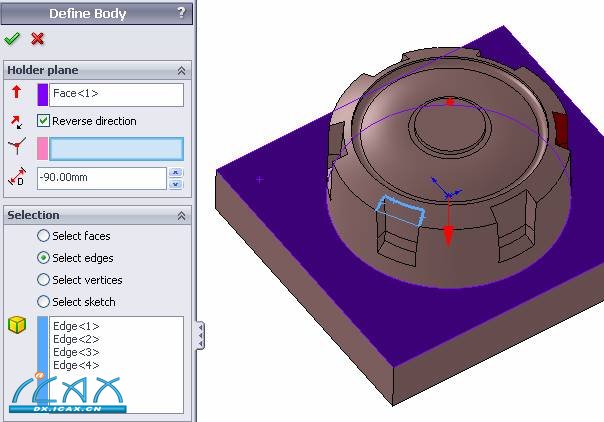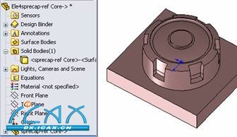 1点击  ,打开装配体文件\QuickMold AP\sprecap\sprecap-ref Assembly.SLDASM。 2点击3DQuickMold/ start project,或者点击启动图标  ,启动3DQuickMold。 点击  ,选择  ,切换到后模零件档。 3,点击电极设计图标  ,则出现  电极设计对话框,选中  ,点击  , 则生成一新的电极零件文档,文件名为默认下图所示文件名。 4,选择如下图所示两点,点击  ,则生成一通过参考点的曲线。 5,选中  ,点击  ,则出现定义电极本体  的对话框,在  栏选择如下图所示面,确定打火花的方向,其他选项如下图所示。点击  确定。 6,在  电极设计对话框里选中  ,选择如下图1所示两面,点击  ,结果如下图2所示。选中下图3所示的面,点击  ,结果如下图4所示。
