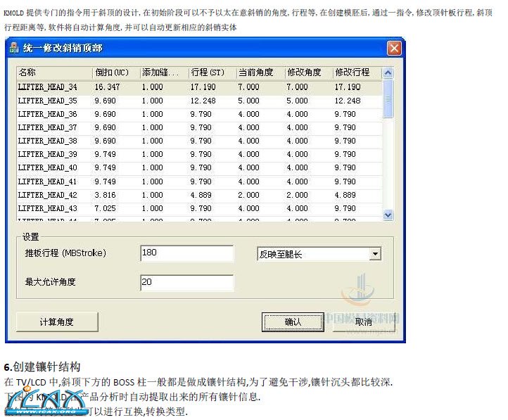 5.批量创建斜销在产品分析节点中,确认或修改斜销类型及参考点的设置,后续就可批量创建斜销.若斜销类型相同,可将单个节点参数保存成DB 文件,再选中其余节点加载进来,参数将完全相同.若要再对斜销进行进一步的细节设计,可通过编辑部件指令快速完成.