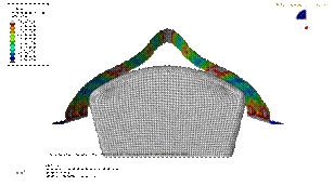 5 蒙皮拉伸成形有限元仿真 考虑到蒙皮拉伸工艺与拉形设备密切相连,本论文参考了成飞公司某蒙皮数控拉形机的运动特点建立有限元仿真模型。在建模过程中,简化了拉形设备,主要通过控制夹钳区域的运动轨迹来实现蒙皮拉伸工艺过程。为了更贴近实际效果,本论文采用了基于位移控制的成形过程,根据蒙皮拉伸的实际成形工艺也分为三个阶段: 1) 预拉伸——模具保持不动,左、右夹钳夹住板料,分别水平向外拉伸一定的量,使得板料进入屈服状态。 2) 包覆——该阶段在实际操作过程中应当满足三个方面的要求:a) 使模具上顶,使板料包覆模面;b) 令夹钳绕拉伸筒缸端面中心旋转,始终保持夹钳的拉伸方向与模面相切;c) 保持对板料的拉伸力,且拉伸力大小与预拉伸阶段中的板料屈服应力直接相关。 3) 补拉伸——模具保持不动,左、右夹钳沿包覆阶段结束后模具与板料的切线方向进行定量拉伸,实现进一步塑性变形,并完全和模具贴合。 5.1 模拟成形步骤 Abaqus将成形数值模拟过程分为了部件、属性、装配、分析步、相互作用、载荷、网格、作业、可视化、草图10个模块。对于蒙皮拉伸而言,主要有以下几个步骤: ① 在部件模块中导入实体,即板料与模具,并建立它们的壳单元; ② 在属性模块中为板料定义材料属性,并指定模具为离散刚体; ③ 在装配模块中将导入的实体按照实际成形位置摆放好,并建立相应的坐标系; ④ 在分析步模块中创建分析步及场输出条件; ⑤ 在相互作用模块中创建相互作用及约束; ⑥ 在载荷模块中为每个实体建立边界条件,并创建相应的载荷; ⑦ 在网格模块中为每个实体分别划分网格; ⑧ 建立并提交作业。 其中,蒙皮拉伸数值模拟的板料所采用的材料是O态Al-2024,其主要参数如下所示: 杨氏模量 泊松比 屈服强度 材料常数 强化系数 73GPa 0.33 68MPa 443MPa 0.254 5.2 加载轨迹研究 在上述的成形步骤中,边界条件的设置是极为关键的,它主要包括控制模具和板料的运动及摩擦。对于蒙皮拉伸数值模拟来说,其边界条件的主要作用对象是夹钳区域的加载轨迹,加载轨迹的优劣直接影响到数值模拟的好坏。 根据蒙皮拉伸的实际成形工艺的三个阶段,在Abaqus有限元仿真过程中通常被简化为两个阶段,其中将实际成形工艺过程中的包覆阶段分属于预拉伸和拉伸阶段,并始终保持模具不动,只依靠夹钳区域的运动轨迹带动板料做相对运动,即: 1) 预拉伸——模具保持不动,左、右夹钳夹住板料,分别同时水平向外并垂直向下拉伸一定的量,使得板料进入屈服状态并基本包覆模面。 2) 拉伸——模具依然保持不动,令夹钳绕拉伸筒缸端面中心旋转,始终保持夹钳的拉伸方向与模面相切,并保持对板料的拉伸力。 其中,在拉伸阶段,夹钳区域的加载轨迹通常选择为直线,这么做的好处是加载轨迹的路径容易确定,对于模面曲率较小且模具侧面不需要贴模的情况,该方法的数值模拟过程及结果都较为真实。但是,对于模具侧面也需要部分贴模的情况,该方法的弊端就显现出来了。本论文按照传统加载轨迹和改进后的加载轨迹分别进行了数值模拟,通过对比两种加载轨迹的仿真过程及结果,证实了改进后的加载轨迹使得蒙皮拉伸数值模拟过程更加真实,且结果更加可靠。 5.2.1 传统加载轨迹 传统加载轨迹为直线加载,该直线为预拉伸阶段结束时的夹钳区域到拉伸阶段结束后贴模状态时的两点连线,如图5所示。 图5 直线加载轨迹 显然,按照这种直线加载轨迹进行拉伸,无法保证夹钳对板料始终保持拉伸力,如图6、7所示。 图6、7 直线加载拉伸过程 可以看到,为了使板料与模具侧面贴合,加载轨迹的直线与板料平面的夹角<90°,这就意味着夹钳区域的加载方向与板料所受拉伸力的方向相反,因此,板料无法始终保持处于拉伸状态,其结果就是板料松弛、顶部突起。虽然随着加载的进行,板料最终有可能贴合模具,但该数值模拟已经失真,其过程及结果无法令人信服,失去了有限元仿真的意义。 5.2.2 改进加载轨迹 针对上述出现的问题,为了使板料始终保持拉伸状态,应当使夹钳区域的拉伸力始终与板料的运动方向保持垂直,即使夹钳区域的加载轨迹始终与板料的运动方向相切,亦即使夹钳区域的加载轨迹近似为板料的运动轨迹。 从实际的蒙皮拉伸过程中不难看出,蒙皮在夹钳的带动下始终保持拉伸状态,其运动轨迹可以近似为一段圆弧,且该圆弧从预拉伸状态结束时夹钳区域所在位置开始,到板料与模具侧面贴合时结束。 该段圆弧的圆心实际上为板料在拉伸阶段运动时的“转动轴”,而该“转动轴”可以近似为模具两侧的倒角区域,其圆心角≈90°,半径为倒角区域与板料预拉伸状态后的边界之间的距离,通常按照经验,取板料长度的5%作为预拉伸状态后的变形量,如图8所示。 图8 改进加载轨迹 按照改进后的加载轨迹,在Abaqus的载荷模块中分别建立对于x方向与z方向的幅值曲线表,即可使夹钳区域按照该圆弧加载轨迹进行运动,其主要参数如下所示: 可以看出,从预拉伸阶段到拉伸阶段,板料始终保持拉伸状态,且运动轨迹较为逼真,仿真过程及结果都符合要求,如图9、10、11所示。 图9 改进加载轨迹后的预拉伸阶段 图10 改进加载轨迹后的拉伸阶段 图11 改进加载轨迹后的贴模状态 由此,我们不难看出,在模面曲率较大且模具侧面需要贴合的蒙皮拉伸成形过程中,夹钳区域的加载轨迹需要尽量符