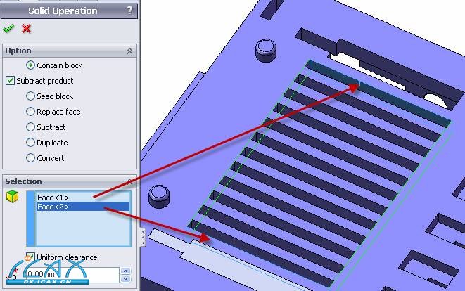 1点击  ,打开零件\QuickMold AP\课程12-常用处理工具\ C-实体操作(无参数)\parting3\练习文件\parting3-ref. part。 2单击  ,选择  ,则出现实体操作  对话框,选中  ,选择如下图所示2面,点击  确认。 结果生成一无参实体,如下图所示。 3,单击  ,选择  ,则出现实体操作  对话框,选中  ,选择如下图所示2面,点击  确认。 结果生成12个无参实体,如下图所示。 4,单击  ,选择  ,则出现实体操作  对话框,选中  ,选择如下图所示2面,点击  确认。