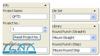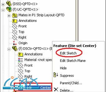 请注意全文中“RMB”的意思是单击鼠标右键。 学员应具备有SOLIDWORKS装配体的基本操作,这对于课时是最基本的SolidWorks设计知识。 在料带排样设计完成之后,下面的工作就是如何设计冲头。 • 创建冲头组件环境 • 创建所有的冲头结构 • 修改冲头 o 固定方式 o 转换直冲针为台阶形 • 创建用户自定义结构,如切缝、突包和成形等。 • 用户自定义结构,如导料块和引导针冲头。 • 干涉检查与固定 本课时将基于如下排样进行。 准备冲头设计 1. 打开文件\Training\Tutorial 6\P1 Strip Layout.SLDPRT。 3. 输入项目名称= QPTD, 项目号 = 1, 命名习惯= *1-*3, 模架样式= 0, 圆冲头(直身型) = Misumi Straight, 圆冲头(阶梯型)= Misumi Round Step, 完成其它设定后单击确定 。4. 单击3DQuickPress/模架结构/间隙值,确认上模板和脱料板的是否同时生效。 注意:取消上面两项的话模板将不会被创建。 5. 从装配体特征树下,展开(DSS)-QPTD ,双击Die Set size 草图如图所示改变模具标注尺寸。 编辑在UC、MC、LC子装配体下DSCtr-xxxx的Die set Center草图,来调整模具中心。 6. 展开特征树,右键编辑在DSCtr-QPTD下的 Die set Center草图。 7. 点A处框选并拖到B处选择草图实体,在对话框中设定X=50mm Y=0 。 8. 单击确认角上的确定后退出草图。 9. 在绘图空白区域右键,选择编辑装配体模式。 |