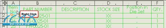请注意全文中“RMB”的意思是单击鼠标右键。 零件编号 模架设计有上、下模两种配置来显示,显示壮态比配置显示有更好的性能。 1. 打开\training\Whats new V3\Drawing\BOM下的0025-01.slddrw工程图。 2. 选择所有视图点插入/表格/材料明细表,在表格样式模板选择\training\Whats new V3\Drawing\BOM下的3dqpballoon.sldbomtbt。 3. 单击编辑删除BOM表(第2步使用SOLIDWORKS的缺省模板,我们可以不用些表格)。 6. 框选所有的编号后点3DQuickPress /工程图与加工工具/分类编号(扩展方式),单击OK确认缺省设定,确认所创建的BOM表格。 7. 在项目号右键还可以调整BOM表里编号的排序。 |