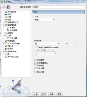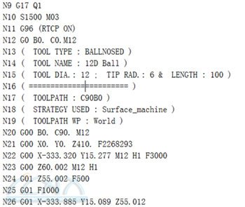 1、PowerMILL2010版本增加“矢量方向”功能有什么作用? PowerMILL2010版本新增加了“矢量方向”功能,通过它并配合使用PM-POST定制的后置处理文件,可以正确输出AC轴角度,这对于3+2轴路径尤其有用! 可以解决的问题: ● 解决C轴角度不等于0,而B轴角度等于0的情况下,能够正确输出C轴角度。 ● 避免因为编程人员没有给操作人员讲清楚C轴角度多少时,操作人员忘记修改C轴角度而出现的主轴干涉现象,严重的会造成撞机发生。 ● 可以加工很多只旋转C轴就能加工的区域,提高加工效率。 2、如何使用PowerMILL中的“矢量方向”功能? 1)、在任意加工策略对话表格,打开“刀轴”选项,见下图: 2)、点击“方向矢量”打开此选项开关,并进入“方向矢量”对话框菜单,见下图: 在上图设置“固定方向”,方位角=90度(类似于C轴),仰角=0度(类似于B轴)。 3)、计算NC程序 4)、输出NC程序,注意输出坐标系类似于正常情况下的3+2轴设定,坐标系选择世界坐标系或用户自定义的输出坐标系。见下图: 打开NC代码,可以看到C轴角度90度已经正确输出了(如下图所示): 5)、在PowerMILL加载已经定制好的带矢量定位功能的仿真机床,仿真刚才的刀具路径:可以看到C轴90度,B轴为0,正确仿真并避免机床主轴和工件的干涉。 |