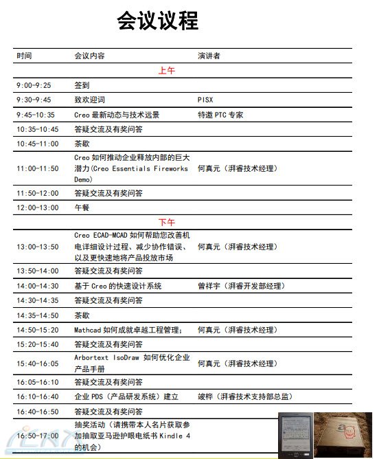 本次培训名额有限,不超过60名,额满为止,凡参加培训者将会获赠Creo 、Mathcad最新版本试用光盘,更有机会获得PTC内部绝密原版电子学习教材一套以及价值600元的目前最为火爆的护眼电纸书:亚马逊(Amazon) kindle 4!(抽奖)