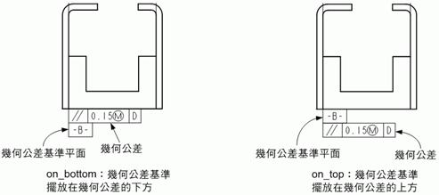 ‹dual_secondary_brackets:当dual_dimensioning设为primary[secondary]时,可再利用dual_secondary_brackets指定辅助尺寸是否要显示出括号。若dual_secondary_brackets设为yes,则在括号内显示出辅助尺寸;若设为no,则直接显示出辅助尺寸,没有括号。 ‹dual_metric_dim_show_fractions:当主单位(或三维几何模型单位)为分数时,决定双重尺寸中的公制尺寸是否要显示为分数。若dual_metric_dim_show_fractions设为yes,则当主单位(或三维几何模型单位)为分数时,双重尺寸以分数显示;若设为no,则当主单位为分数时,双重尺寸不以分数显示 ‹dual_secondary_units:指定双重尺寸中辅助尺寸的单位。 ‹gtol_datums:设置几何公差的基准轴、基准平面及参照几何的显示方式,下图所示为基准平面的显示方式。 ‹gtol_datum_placement_default:几何公差基准是摆放在几何公差的上方或下方(几何公差基准是指标注几何公差时所设置的基准轴、基准平面等几何资料,而几何公差的介绍请见本书的9-2节)。 ‹gtol_dim_placement:当几何公差附在一个含有文字的尺寸时,可使用gtol_dim_placement决定几何公差的摆放位置。若gtol_dim_placement设为on_bottom,则几何公差会被放在尺寸的最底部;若gtol_dim_placement设为under_value,则几何公差会被放在尺寸的下方,文字的上方。 ‹half_view_line:指定半视图的分界线型式,CNS规定是采用中心线。其选项如下:(1) solid:分界线为实线、(2)symmetry:绘制一条延伸出零件外的中心线,作为分界线、(3)none:在分界线外一小段距离处绘制对象(注意︰设置为none时,建议从位移超过实际中心线的基准平面处切割视图,如此基准轴便可显示出来,且零件中心线的位置亦会清晰)。 |