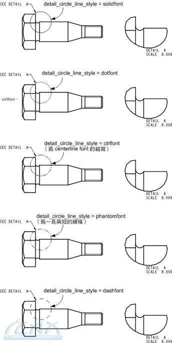 def_view_text_height:设置视图名称、割面线文字和局部视图名称的文字高度,默认高度为3。 ‹def_view_text_thickness:设置视图名称、割面线文字和局部视图名称的文字宽度。默认宽度为0,亦即使用CNS的制式规定:拉丁字母及数字的粗细为字高的1/10,中文的粗细为字高的1/8。 ‹def_xhatch_break_around_text:控制剖面与剖面线是否沿文字破断。 ‹def_xhatch_break_margin_size:控制剖面线与文字之间的偏移距离。 ‹default_dim_elbows:尺寸的引线是否要以弯肘的型态显示出来。 ‹default_font:默认的文字字型。 ‹detail_circle_line_style:设置局部详图的边界圆的线型。其默认选项为solidfont,代表边界圆为实线,其它选项包括dotfont、ctrlfont、phantomfont、dashfont等,如下图所示。 |