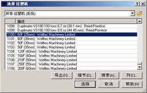 (9)在图14.12中,单击【注塑机】选项下的【选择】按钮,弹出【选择注塑机】对话框,如图14.13所示,选择第1100个注塑机作为成型注塑机。