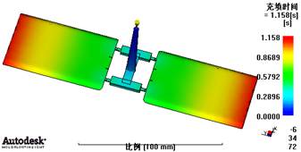 充填时间(Fill Time)分析结果如图12.18所示。从充填时间分析结果的图中可以得知,浇口两侧方向的充填时间几乎同时到达,可以接受。