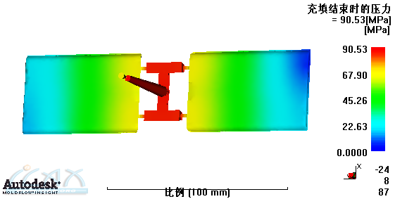 压力(Pressure)分析结果如图12.19所示。压力分析结果图显示了充填过程中充填结束时模具型腔内的压力分布。进料口处最大压力为90.53MPa,型腔内的最大压力为71.96MPa。