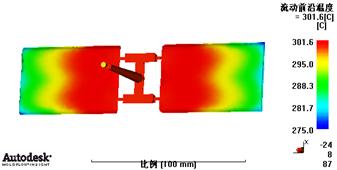 流动前沿温度(Temperature at Flow Front)分析结果如图12.22所示。模型的温度差不能太大,合理的温度分布应该是均匀的。
