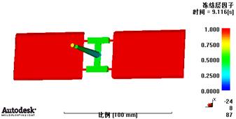 冻结层因子(Frozen Layer Fraction)分析结果如图12.23所示。从冻结层因子分析结果的图中可以得知,在保压结束这一时刻,制品表面的冷却层的厚度。
