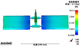 体积收缩率(Volumetric shrinkage)分析结果如图12.24所示。从冻结层因子分析结果图中可以得知,在这一时刻,体积收缩率的最大值为,处于流道中,制品表面颜色梯度很小,表面收缩均匀。体积收缩率的结果为越均匀越好