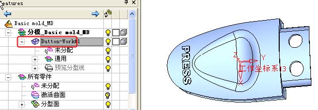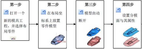 导言 CimatronE10.0为模具设计者提供了一种工作模式,我们称之为模具工程。它把产品的分模构建(如模型的自动断开、分模线以及分模面的设计)与整体模具设计(如模架的选择和型腔的布置等)紧密结合起来,从而为设计者节约大量的时间。 此基础模具设计教程通过设计一个简单的单个型腔和型芯的模具,简要地浏览了Cimatron模具工程的工作环境与流程结构。 第一步 1. 开始一个新的模具工程 命名主装配为: Basic mold 为主装配选择创建一个新的文件夹 注意: . 每一个模具工程都是由模具工程设置向导开始。 . 主装配名称为必须。 . 可以选择为主装配创建新的文件夹。 . 当开始模具工程时,必须已经明晰模具的布局情况,即设定相应的布局零件。 . 布局零件可以选择新创建,也可以从预先定义好的布局零件库中选取。 注意: . 此步创建了一个模具装配,从结构上它包含了定板系统、动板系统以及顶出系统部分。 . 分模系统在稍后会包括所设计的工件和它的分模面零件,用此分模面零件可以方便地断开预设毛坯而生成模具的型芯和型腔。当把分模完成的部件载入模具设计环境下时,分模系统部分会被压缩以释放主装配下的数据量。 . 蓝色的矩形方框代表了预先设定的模架外形尺寸,它可以被编辑到任意尺寸以适应最终设计的真实模架外形尺寸。 第二步 1. 进入快速分模环境 2. 放置工作零件 放置零件在布局坐标系上。此步操作也会创建工作零件模型的坐标系: WorkCS 。 选择编辑工件坐标系就可以看出此坐标系位于工件几何模型的中心处,并且还可以选择是否创建包容盒。 这里所有的数值都可以在后面的过程中进行修改,包括布局零件的中心位置,所以Cimatron提供了很多的方法可以自由控制零件模型的位置。 在本教程中,使用默认的设置即可,如下图所示,选择编辑工件坐标系。 注意: . 为在某特殊点创建工件坐标系,可以选择工件坐标系命令中可选部分的拾取参照坐标系选项(可以事先在零件模型创建想要的坐标系)。 3. 查看结果: |