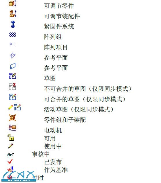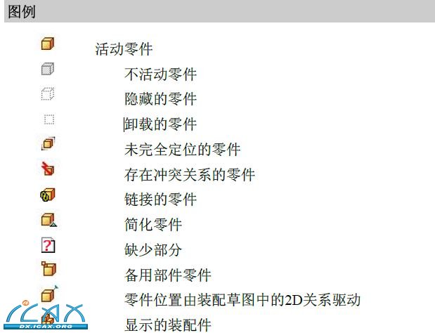 PathFinder(路径查找器)中的符号反映了装配件中组件的状态。下表解释了PathFinder(路径查找器)顶部窗格中使用的符号。