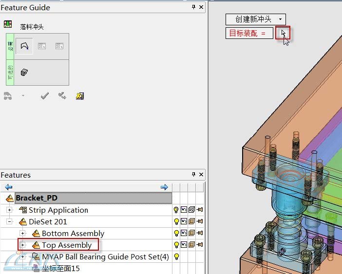 2.打开Bracket_PD.elt后,点击右侧向导工具条中的“落料冲头”指令 在要求选择目标装配时,选择左侧特征树中的Top Assembly。