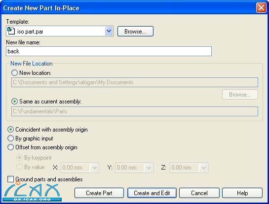 在New(新建)文件名字段中输入back。务必严格按照图示在对话框中输入其他所有数据。在新文件位置字段中,找到该课程的工作文件夹。点击Create and Edit(创建并编辑)。Solid Edge打开新的零件文件并显示装配文件radio.asm中包含的草图。
