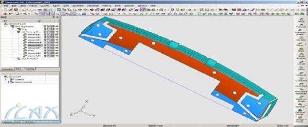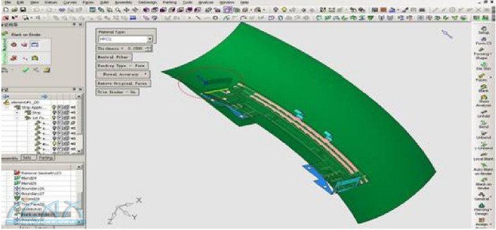 CimatronE的Die Design Solution为五金模具,尤其是级进模具提供了完整的设计解决方案,包括工位设计、料带排样设计,模具结构设计,模具零部件设计(简单冲头,成型冲头)等,本篇重点介绍针对复杂钣金展开策略,即辅助面展开(Blank on Binder),适用于零件结构复杂,通用的展开、折弯功能很难实现的零件展开工作。下面介绍如图零件的三个折弯区域的展开。 图1 该零件的三侧面折弯都很难通过一次常规的展开即可完成。必须通过辅助面展开,思路是通过借助相邻曲面,建立辅助面,将折弯面展开到辅助面上完成。首先,通过对底面曲面(红色面)进行延伸得到辅助展开面,所使用的功能是 CimatronE提供的通用的CAD曲面造型功能。如下图2,图3。