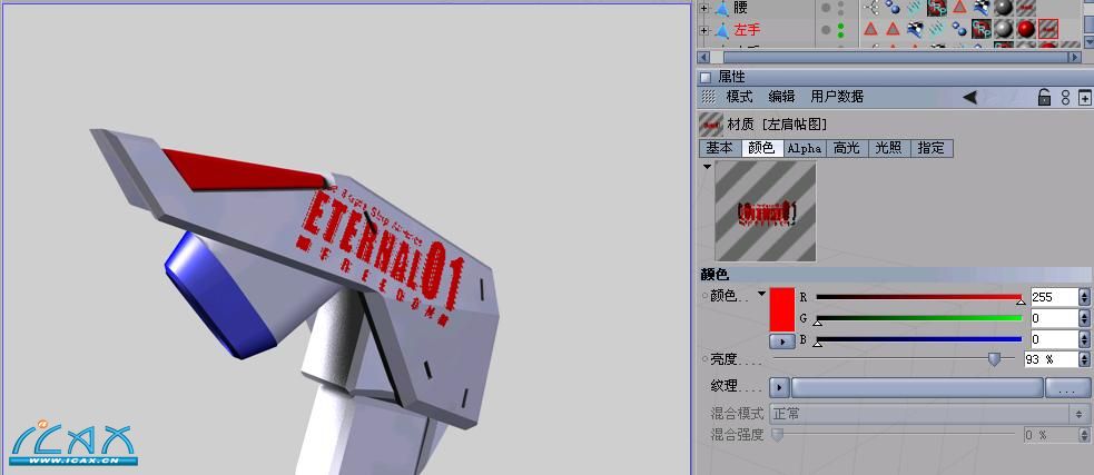 4、把材质球拖到物体上,调整其大小和位置 把材质拖到物体上后默认生成的投影方式是uvw投影,但这是不行的,我们首先要把材质标签中的投影方式改成“平直”。设置好后界面与渲染如下 从渲染图中可以看到,尽管改了投影方式,但贴图的位置角度与大小都不是很好,还要对其进行调整。 选中物体与材质标签,然后选取界面左边的纹理编辑模式,此时将会显示纹理映射平面,这时就可以用上方工具栏中的移动和旋转工具进行调节了。另外由于我们只要一处贴图,因些我们要把材质标签中的“平铺”去调。调结好后如下图所示。 这时得到的渲染图如下。 现在这个状况已经是接近想要的效果了。en,但明显可以看出些贴图有些模糊,这是贴图精度本身的问题。 一般cg作品中用的贴图精度都很高,几k x几k的图都是家常便饭,这个300x300的贴度也就只能达到这种效果了。 之前一直都在讲alpha通道的设置,实际上我们还可以对颜色通道进行设置来获得自己想要的logo颜色。如下图就是把改颜色改成红色后的效果。当然,我们还可以对通道进行设置来获得想要的效果,如发光,荧光等。 |
