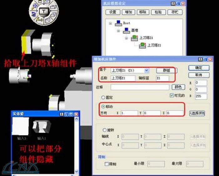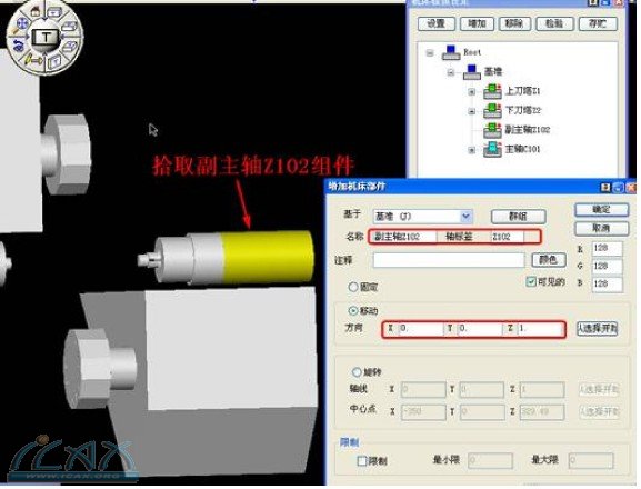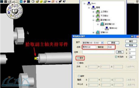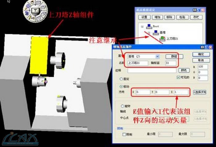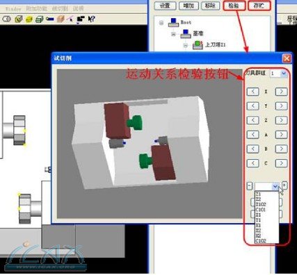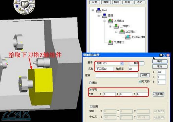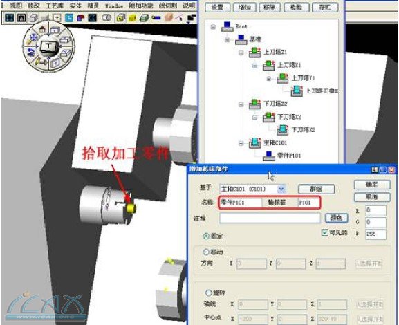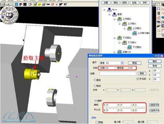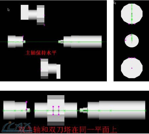 MTM多任务加工领军地位的必要条件:机床仿真功能。面对更复杂的运动结构时,GibbsCAM可根据实际机床结构自行创建机床,进行机床仿真,并结合同步管理器,调整程序,使多刀塔多主轴的程序以最优化,最可靠的方式同步运动,确保安全加工。下面我们将以QTT65机床为例,介绍GibbsCAM机床仿真定制的流程: 一.机床建模 2.机床的尺寸要实际测量,根据客户要求,一般精确绘出主轴和刀塔位置及相关干涉部件。 3.造型时注意所有部件尽量和实际机床位置尺寸一致,双主轴和双刀塔须在同一平面上(也有的机床主轴和副轴在X向是不一致的)。 二.机床运动装配 1.加载机床模型,进入构建机床。装配机床时注意坐标系的位置:坐标系在机床原点,且以XY坐标系存贮装配好的文档。 机床原点位置在主轴卡盘中心,Z向位置因不同机床而有所不同。 2.机床模拟设定窗口打开后,点击增加按钮,拾取要定义的机床部件(拾取后显示黄色),基于ROOT目录,名称命名为“基准”,轴标签“J”。打开颜色对话框可以定义基准颜色。此部件为非运动部件。点击确定,定义完成。 后面我们分别定义上下刀塔和主副轴的运动关系。 3.上刀塔组定义: 1)上刀塔Z1轴定义:拾取Z1轴组件,在“基准”目录下名称文本框输入“上刀塔Z1”(名称可以根据习惯自定义)。轴标签输入“Z1”(注意轴标签“Z1”是固定的,建议以下各轴也使用是固定标签)。Z1轴为Z向直线运动,沿哪个轴向移动即在哪个方向空格输入1或-1(+-1分别代表不同矢量方向),所以移动方向参数设置为:“X0,Y0,Z1”,注意Z1轴矢量。 4) 上刀塔刀盘定义:拾取刀盘组件,在“上刀塔Y1”目录下继承“上刀塔刀盘K1”。K1轴绕Z轴旋转运动。所以旋转轴线参数设置为“X0,Y0,Z1”(绕哪个轴向旋转须在哪个轴线空格输入1或-1)。另外还必须指定旋转中心,K1轴旋转中心是刀盘面中心,拾取刀盘面中心点,点击“从选择开始”即可自动载入点坐标“X350,Y0,Z379.49”。 4.下刀塔组定义: 下刀塔其它组件同上刀塔设值,不再累述。 5. 主轴定义: 4)副主轴C102定义:拾取副主轴C102组件,注意在“副主轴Z102”目录下继承“副主轴C102”,轴标签输为“C102”,旋转轴线为“X0Y0,Z-1”(注意副主轴旋转矢量和主轴相反,所以输入-1),旋转中心为“X0Y0,Z0”。 5)副主轴加工零件定义:拾取副主轴加工零件,在“副主轴C102”目录下继承“零件P102”,零件标签为“P102”。运动状态设置为“固定”。 6.刀塔的设置: 点击设置按钮,在设置参数对话框勾选MTM,设置2组刀具群组,再分别设置两组刀具群组的原点,注意和机床实际刀具原点统一。 下刀塔设置参照上刀塔。 9.注意机床装配时轴标签的使用: 机床装配时建议采用固定标签,罗列如下: X1, Y1, Z1, A1, B1, C1 ,K1第一刀塔组标签 X2, Y2, Z2, A2, B2, C2,K2第二刀塔组标签 X3, Y3, Z3, A3, B3, C3,K3第三刀塔组标签 X99, Y99, Z99, A99, B99, C99,K99第九九刀塔组标签 X101, Y101, Z101, A101, B101, C101,P101第一主轴组标签 X199, Y199, Z199, A199, B199, C199,P199第九九主轴组标签 (以上K代表刀塔旋转标签,P代表零件标签,其它X Y Z A B C分别代表轴运动部件标签)更多内容参见GIBBS软件自带教程《Machine Sim》。 至此机床的运动创建完成。 另外一般机床所有刀柄均为活动刀柄,所以不能在机床构建时创建刀柄,刀柄的创建需在零件编程状态下自定义刀柄。 1.注意创建刀柄时,刀柄尖点均指向XZ坐标系原点(作为刀柄统一的基准)。 2.车刀刀柄需和实际刀柄的方向一致才能正常加载。 3.铣刀刀柄创建一个方向即可,不同方向铣刀刀具加载刀柄后,铣刀刀柄会自动旋转方向。 4.上下刀塔的位置关系可以通过刀具交换位置进行重新调整: |