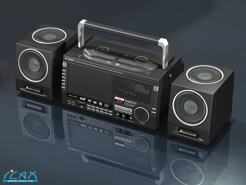 图解便携式多媒体影音系统外观造型(参赛作品) 便携式多媒体影音系统 图解外观造型设计及渲染过程 设计目标 开发一款针对家庭用户的视听综合系统,要求具有广泛的适用环境,兼容当前主流音视频格式,光盘录制与光盘复制,外观小巧,方便移动。 功能要求 CD/VCD/DVD等各类影视光盘的播放与复制 ASF/AVI/DIVX/RM/RMVB等视频格式播放与记录 MP3/MP4播放器功能 中波/短波/调频立体声/电视伴音接收功能 内置6.5英寸宽屏LCD VFD荧光数码管状态显示屏 声场型双通道立体声分体式音箱 5.1声道功率输出端子 USB数据接口 SD内存扩展 交/直流两用(直流使用10X2000mAh AA型镍氢可充电电池) 适用环境 电脑多媒体音响 小型桌面视听音响 卧室视听音响 移动视听音响 基于以上要求,综合电子线路尺寸局限,主机外形尺寸定为320*160*200mm。 外观采用庄重的黑色,棱角分明的怀旧式双卡收录机风格。利用超大的透明碟片窗口和深陷的显示屏来充分体现黑川纪章的灰空间审美概念,避免矩形立方体带给人的封闭单调感觉。 下面是简略的建模与渲染过程 因为是产品外观设计,用于市场部评估及客户看样,建模目的仅用于渲染出样图,不必考虑内构,但必须在电子部件样板限定的基本框架下进行建模。 建模过程非常简单,几乎都是SOLIDWORKS的基本操作,甚至连曲面都没有涉及,所以并未把详细过程一一列出,详细步骤可参考原文件(附后) 一、主机主体建模 创建主机草图 |