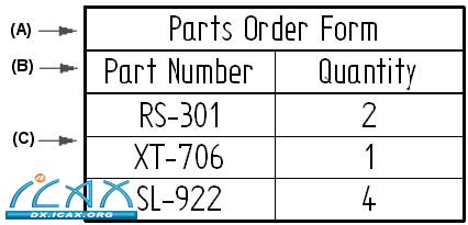 零件明细表包括标题(A)、列标题(B)和列数据(C)。