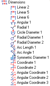 在PathFinder(路径查找器)的PMI集合中,不同类型的尺寸标注(例如线性、半径、角度)显示不同的符号和元素名称。