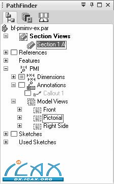 • PathFinder(路径查找器)中PMI集合上方的一个单独Section Views(剖视图)集合包含已在文档中定义的所有3D剖视图。
