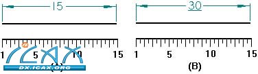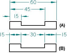 使某个从动尺寸返回实际值。该命令只能用于已经编辑的尺寸值。编辑尺寸值将替代原始值,使尺寸标注失去比例。例如,可以把图中的尺寸标注数值从15毫米(A)改为30毫米,但是图中线段的实际长度仍然是15毫米(B)。