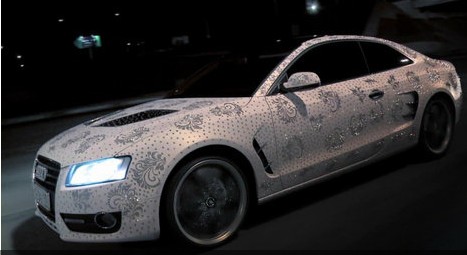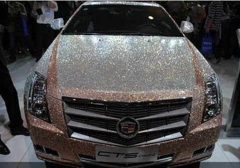现在展现在各位面前的是一辆镶嵌着100万颗施华洛士奇水晶的迷你Cooper,这些水晶共有40种不同色彩,组成10个代表美国特色的绚丽图案,包括星条旗、雄鹰、自由女神像、总统雕像山、白宫、国会大厦、航天飞机、好莱坞标志、华盛顿纪念碑和克莱斯勒大厦等,因此该作品的名称就叫“美国标志”。 这一作品由来自加拿大安大略的艺术家Ken和AnnieBurkitt共同完成,100万颗水晶全部由手工一颗一颗地镶嵌在迷你Cooper的车身上。这辆价值连城的小车将成为伦敦皮卡迪里广场的瑞普利信不信由你博物馆(Ripley’sBelieveItorNotMuseum)的藏品。 俄罗斯公司Shampa 正在莫斯科某地低调的展示自己的改装奥迪A5,与普通改装者谈论引擎、轮胎、XXX 不同,这一次他们的改装的主题是华丽。动用45万颗施华洛世奇水晶将整部车的外壳包裹住。包括轮胎侧面等等,真是没有你想不到,只有钱砸不完呀。 镶嵌38万颗水晶钻石的凯迪拉克CTS-Coupe (5/10)