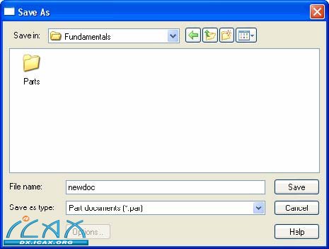 在Save As(另存为)对话框中,在Save in:(保存位置:)字段中输入课程文件夹位置。在File name:(文件名:)字段中,输入newdoc。注意,在保存文件时,默认情况下会在文件名的末尾添加扩展名,不必手动添加。Solid Edge可根据正在保存的文件的类型自动添加一个扩展名。点击Save(保存)。