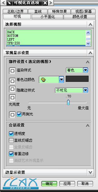 可视化首选项针对新部件的显示状态,这包括新建对象的背景颜色,线型,着色状态等等。