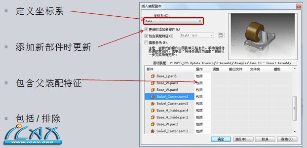 插入装配副本(IAC) 插入装配副本(Insert Assembly Copy):在装配件中,插入外部装配件,作为装配特征放置在顶层结构。 用途: 装配结构再利用(管件、钢结构、管道)。 材料明细表(BOM)等同于源装配件中的部件。 装配过程状态创建和定义。 为关联镜像打基础 发布多实体零件文件 ——– 使用此功能生成设计体的关联装配件。 源文件改动后,更新到子装配件。 装配环境中运行 IAC 命令: 第一步:选择复制到当前装配的父装配源文件。 举例:已设计标准的货柜,而从源装配复制过来的角轮需要更改。 第二步:插入装配副本(IAC)对话框中,设置参数选项。 本章案例part文档下载://kuai.xunlei.com/d/QWTXKHWOVPCR