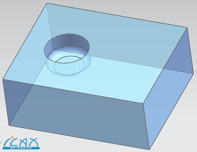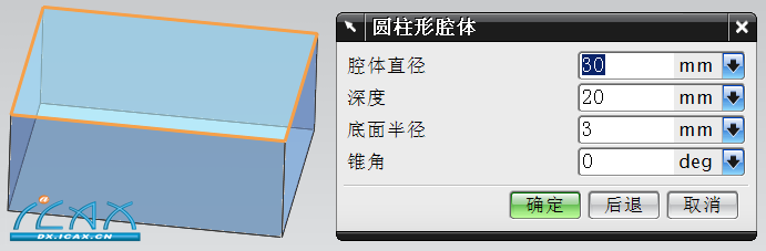 1.【前提】:进入NX6建模(Molding)环境 A.在特征工具条上,单击腔体图标进入 B.或者选择:插入→设计特征→腔体。 2.接着:可以看到弹出【腔体】〖类型选择〗操作菜单:如下图: ![]() 【腔体分类】: 如下图,选取毛胚体的〖上表面〗,接着会弹出【特征参数】定义对话框,并按下图修改参数定义,输入完成后按【确定】。 ![]() 〖备注〗:各参数的几何意义如下图: ![]() ③进行中心定位: 按【确定】后弹出下图的预览界面,并出现定位对话框。 〖备注〗定位方式与圆台类似。 ![]() 【注】:按下图选用【垂直】定位方式定位并输入定位参数如下图 ![]() ④按【确定】得到如下结果: ![]() ⑤特征参数及定位修改: 所有的定义参数及定位,都可以在【导航器】中〖右键〗进行编辑及修改。 〖小结〗:本节重点难点是【圆形腔体】的的〖拐角半径〗及〖锥度〗定义参数及水平参考的理解。 〖附练习文件〗成型特征.rar |