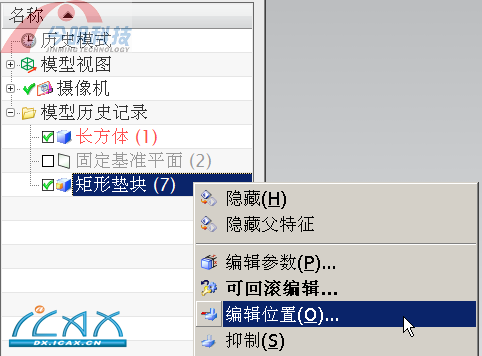 该项用于编辑成型特征在实体上的位置。在部件导航器中选择需要编辑的特征,按MB3(鼠标右键)从弹出菜单中选择【编辑位置(0)……】如下:〖图6-001〗