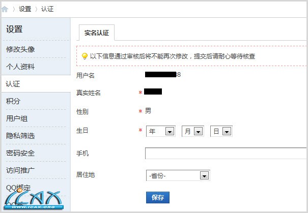 3、点击【认证】按钮,填写真实姓名、性别、生日、手机号码、居住地等信息;