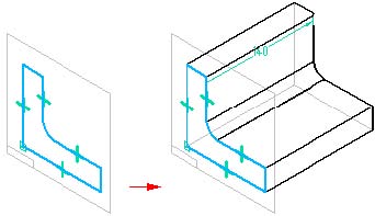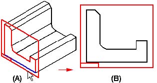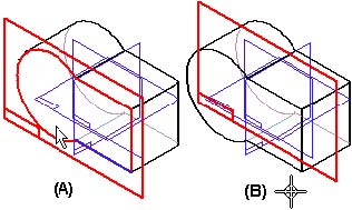 当您创建一个基于轮廓的特征时,就会创建一个局部参考平面。在特征命令栏中有一些参考平面选项可用于指定新参考平面的位置和方向,因此您可以在任意位置绘制轮廓。例如,您可以指定您想创建一个与零件上某个面重合的参考平面。如果选择Coincident Plane(重合平面)选项,当您将光标放在某个零件面上时,将显示新参考平面的动态示意图(A)。当您单击鼠标时,将会显示根据参考平面的X轴放置的轮廓视图(B)。