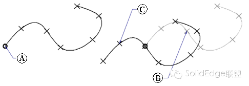 参考点(图6)用于定义变换的起始点,如图7所示,参考点是A点时,阵列预览为左图,参考点更改为B点时,阵列预览为C曲线。