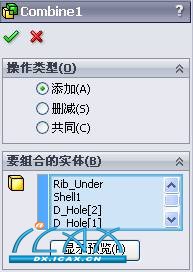 通过【组合】实体特征,用户可以在零件中利用添加、删减或共同多个实体来创建单一实体。