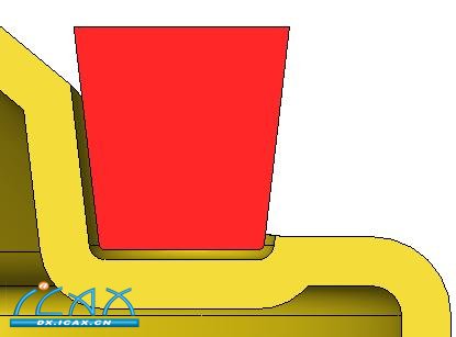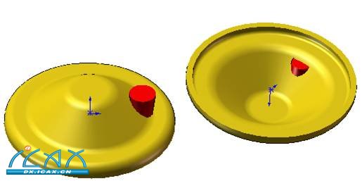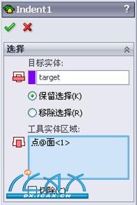 在特征工具栏上单击“压凹“ ,选择稍大的实体作为【目标实体】,选择旋转实体作为【工具实体区域】,如图1-42所示。