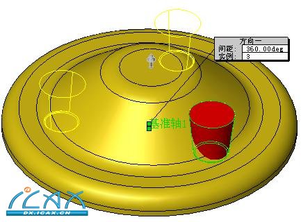 右键单击特征“压凹1”,从快捷菜单中选择【退回】,使退回控制棒位于特征“Fillet1”和特征“Indent1”之间。如图1-46所示,添加工具实体的【圆周阵列】。