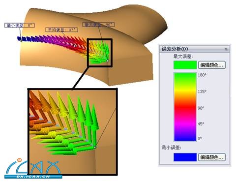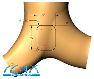 步骤21 设置分析参数 单击“误差分析”,选择图3-40中模型连线,将样本点数滑杆置于大约中间的位置。单击【计算】。 步骤22 显示误差分析图形 如图3-41所示,误差分析的结果以成对的3D箭头显示在所选择的边线上,箭头以不同的颜色直观地显示出两个面沿共同边线的角度变化。用户可以设置箭头显示的颜色。 图3-41 步骤23 添加圆角 在第二个放样的两个锐角边之间添加25mm的圆角,在两个放样之间的边上添加55mm的圆角,如图3-42所示。用户可以使用多半径圆角,或创建两个独立的圆角。 图3-42 步骤24 创建等距平面 如图3-43所示,创建一个相对于上视基准面【等距距离】为100mm的基准面,用于绘制矩形进口管的轮廓草图。 图3-43 步骤25 绘制草图 绘制如图3-44所示的草图。在尖角处绘制圆角,此草图以原点为中心左右对称。 图3-44 步骤26 拉伸凸台 使用【形成到下一面】终止条件拉伸凸台,并加入5°的【向外拔模】角度,如图3-45所示。 图3-45 步骤27 创建圆角 选择拉伸凸台和两个放样之间的交线,创建半径为12.5mm的圆角过渡,如图3-46所示。 图3-46 步骤28 抽壳零件 如图3-47所示,向内抽壳零件,【厚度】为1.5mm。 图3-47 步骤29 保存并关闭零件 |