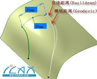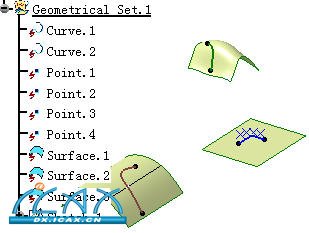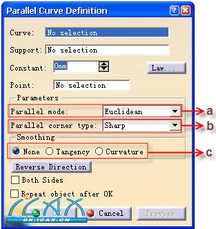 5) 平行曲线 (Parallel Curve)。允许用户创建与边或参考曲线平行的曲线。 打开\Training Part\GSD\ ParallelCurves.CATPart文档,如图4-246所示。 图4-246 图4-247 a.平行模式(Parallel mode)。这里选择“曲线.1(Curve.1)”作为偏移“曲线(Curve)”的参考曲线,定义“曲面.1(Surface.1)”作为平行曲线的“支持面(Support)”,在常量“(Constant)”对话框中输入值30。这里分别以平行模式(Parallel mode)中的“直线距离 (Euclidean)”和“测地距离 (Geodesic)” 偏移两条曲线,结果如图4-248所示,图示中以虚线虚拟了“测地距离 (Geodesic)”的计算方法。 图4-248 b.圆角类型 (corner type)。这里选择“草图.1(Sketch.1)”作为偏移“曲线(Curve)”的参考曲线,定义“曲面.2(Surface.2)”作为平行曲线的“支持面(Support)”,在常量“(Constant)”对话框中输入值-10。这里分别以圆角类型 (corner type)中的“尖的 (Sharp)”和“圆的 (Round)”偏移两条曲线,单击“预览 (Preview)”,图4-249列出了两种类型的结果。 图4-249 如有需要,用户可以通过增加“函数(Law)”来代替常量定义曲线的偏移,或通过“点(Point)”参考来定义曲线的偏移值。 c.光顺 (Smoothing)栏下的选项。该栏下的选项允许用户对偏移的曲线进行光顺,系统默认选中“无(None)”,用户如定义了“相切 (Tangency)”或“曲率 (Curvature)”则出现图4-252所示选项。 图4-252 这里选择“曲线.2(Curve.2)”作为偏移“曲线(Curve)”的参考曲线,定义“曲面.3(Surface.3)”作为平行曲线的“支持面(Support)”,在常量“(Constant)”对话框中输入值25,选择“直线距离 (Euclidean)”作为偏移的平行模式、“尖的 (Sharp)”圆角类型,选择“曲率 (Curvature)”光顺。 “确定(OK)”查看结果并未完全光顺,偏移结果曲线还存在不相切现象,这是因为光顺本身只能光顺较小的不连续;如需改变较大的不连续现象,用户可开启“3D 光顺 (3D Smoothing)”选项,这样结果光顺曲线有可能不完全处于支持面上。图4-253列出了开启与关闭“3D 光顺 (3D Smoothing)” 选项的结果。 图4-253 所需元素定义后,单击“确定 (OK)”创建平行曲线,平行曲线(标识为Parallel.xxx)即被添加到特征树中。 |