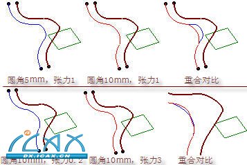 下面我们以文档的实操来描述“圆角(Radius)”和“张力(Tension)”选项。这里选择“圆角.1(Corner.1)”作为3D曲线偏移的参考“曲线(Curve)”,“平面.1(Plane.1)”为“拔模方向(Pulling Direction)”,输入“偏移 (Offset)”值5mm,输入不同的“圆角(Radius)”和“张力(Tension)”值,如图4-258所示。